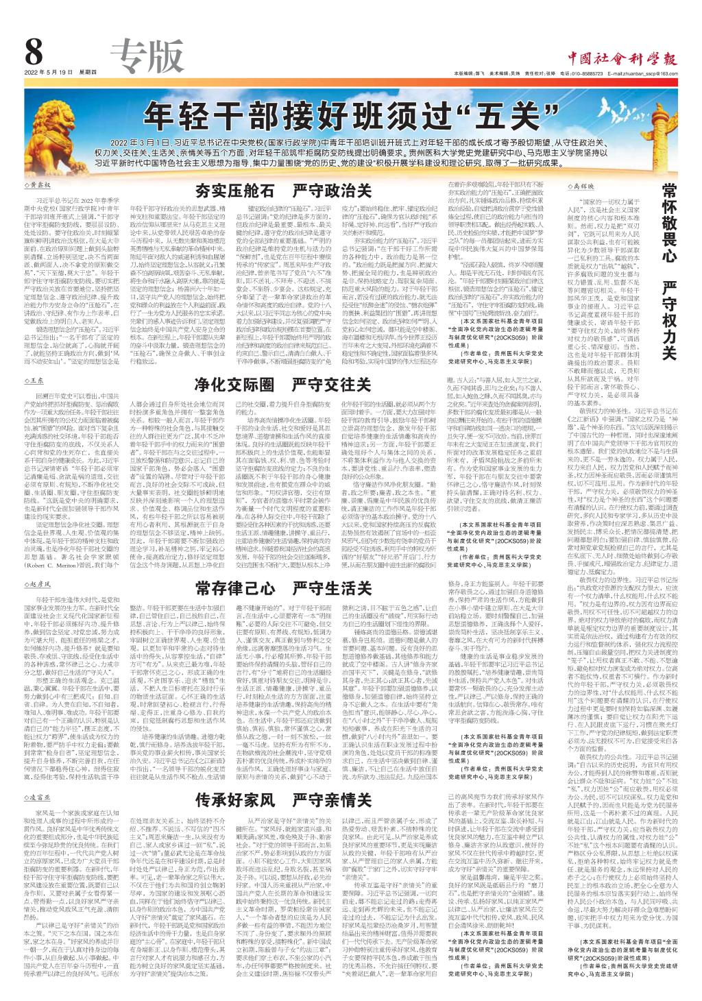 我校党史党建研究中心、bw必威西汉姆联深入学习贯彻习近平总书记系列重要讲话精神,坚持以习近平新时代中国特色社会主义思想为指导,集中力量围绕“年轻干部接好班须过‘五关’”展开理论研究,取得了一系列研究成果。5月19日,《中国社会科学报》第8版整版刊登,包括黄鑫权的《夯实压舱石  严守政治关》、禹辉映的《常怀敬畏心 严守权力关》、王东的《净化交际圈 严守交往关》、赵彦风的《常存律己心 严守生活关》、凌富亚的《传承好家风  严守亲情关》。