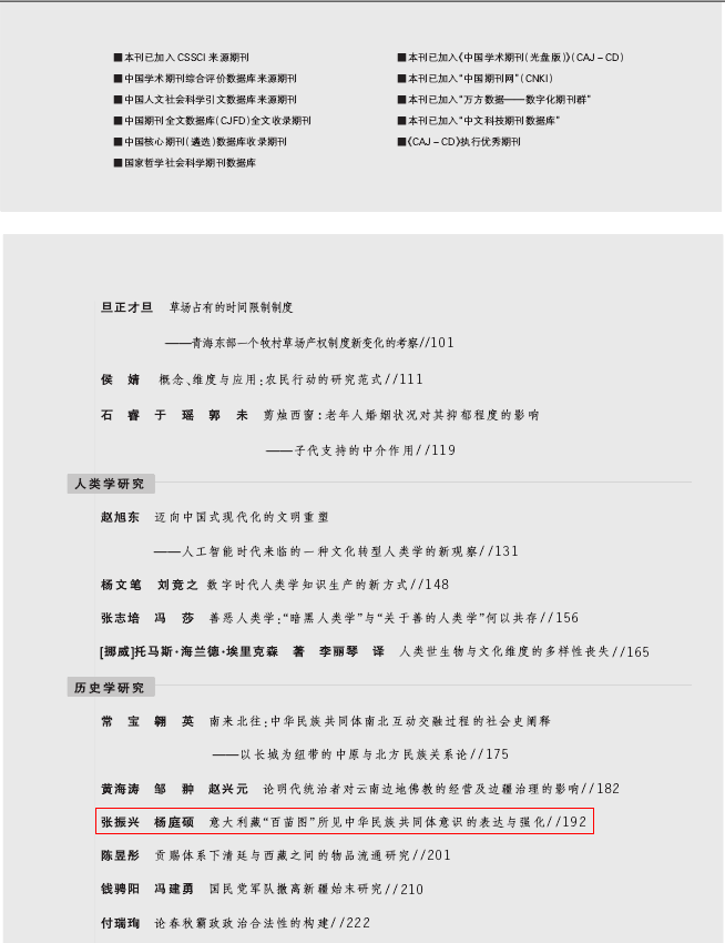 2024年9月,我院张振兴博士在《青海民族研究》(CSSCI扩展版来源期刊/北大核心)(2024年第3期)发表学术论文《意大利藏“百苗图”所见中华民族共同体意识的表达与强化》。文章认为:意大利社会地理学会藏“百苗图”属晚期抄临本,其抄临编绘者立足于时代背景与环境,在继承早期抄临本体例与内容的基础上,对部分绘图做出与时俱进的改写、改绘,生动形象地描绘出清末民初贵州各族民众的时代新貌。在与“百苗图”早期抄临本相应条目绘图进行比较分析后,选取意大利藏“百苗图”内学堂教育之兴起、生计方式之变迁为例;认为作为近代贵州各族群众交往交流交融之典范,其顺应时代发展趋势,从不同社会发展起点向“同步中华”的目标迈进;乃近代中华民族命运共同体意识表达与强化的具体呈现。