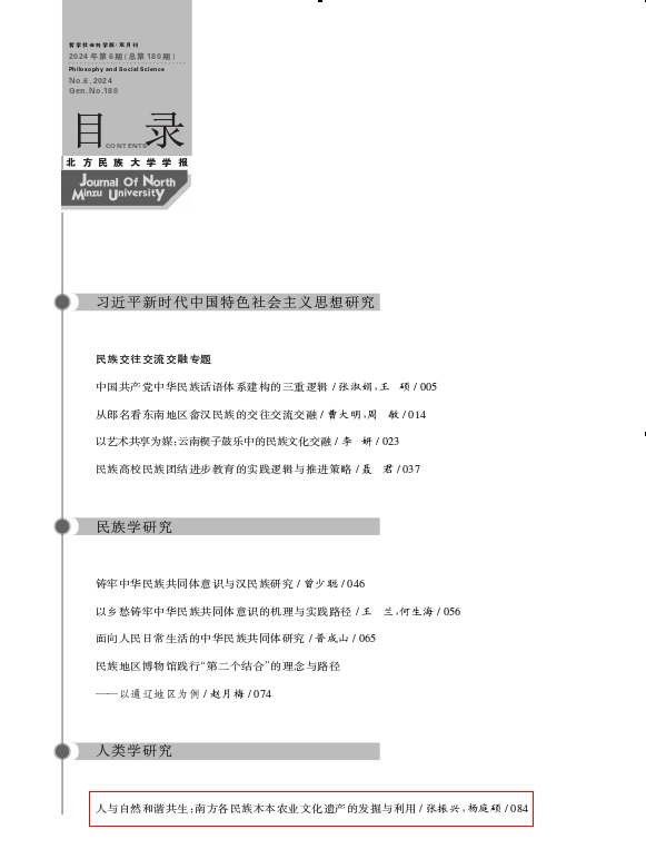 2024年11月,我院张振兴博士在《北方民族大学学报》(CSSCI扩展版来源期刊/北大核心)(2024年第6期)发表学术论文《人与自然和谐共生:南方各民族木本农业文化遗产的发掘与利用》。文章认为:中国乃至世界范围内的重要农业文化遗产立项保护名录中,有不少以木本作物的传统栽培技术及其文化为保护对象。与草本农业相比,木本农业经营的地域范围、配套技术、知识积累及相关制度保障明显不同。当下对木本农业在农业与林业上的分野和利用价值仍存在认识上的模糊不清现象,为此,本文以云南漾濞核桃作物复合系统、云南普洱古茶园与茶文化系统等多项木本农业文化遗产为研究对象,利用田野调查资料,并结合文献史料相关内容,对我国南方各民族传统木本农业文化遗产的发掘与利用展开研究,意在揭示其间人与自然和谐共生之道,助推南方各民族木本农业复兴与我国生态文明建设。