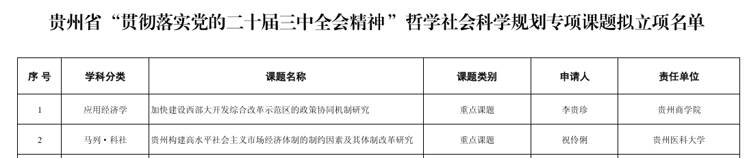 近日,省社科规划办公布了贵州省“贯彻落实党的二十届三中全会精神”哲学社会科学规划专项课题立项名单,我院祝伶俐博士申报的“贵州构建高水平社会主义市场经济体制的制约因素及其体制改革研究”获批重点课题立项,系我院2024年获批的第5个贵州省哲学社会科学规划课题(重点项目2项、一般项目3项)。