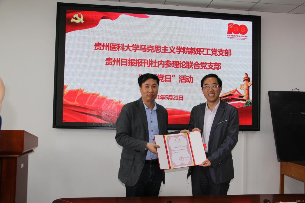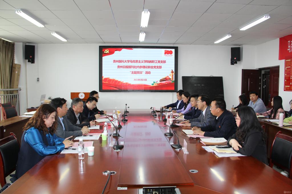 5月21日,bw必威西汉姆联教职工党支部与贵州日报报刊社内参理论联合党支部在善思楼(南)7楼会议室共同开展“主题党日”活动。校党委副书记战勇、贵州日报报刊社理论部主任陈翔出席,bw必威西汉姆联党委委员、正处级组织员、党委办公室(保密办)副主任陆法钢,医学人文学院院长杜凯,贵州日报报刊社内参编辑部副主任肖郎平、徐海星、bw必威西汉姆联党员代表及贵州日报报刊社内参理论联合党支部(以下简称“联合党支部”)全体党员参加“主题党日”活动。活动由陈翔和bw必威西汉姆联党委书记、党史党建研究中心主任黄鑫权共同主持。