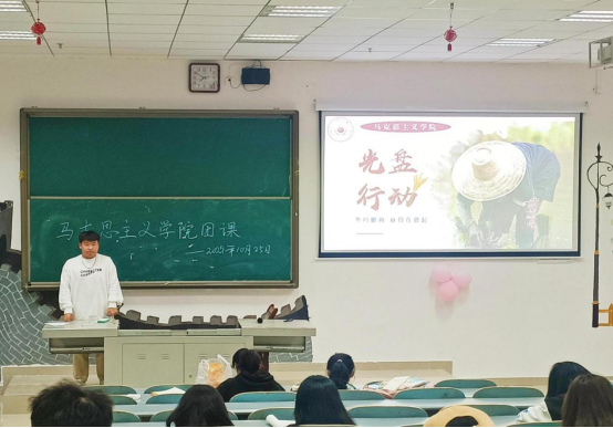 两位团支书向同学们介绍了“光盘”行动的相关背景,让同学们充分认识本次活动举办的目的与意义。全体学生观看了电影《袁隆平》。通过解读袁隆平院士以及围绕粮食战线从事忘我工作的科技工作者们的感人事迹,大家了解到我国粮食生产未来所面临的严峻困难以及生活中继承勤俭节约传统美德的重大意义,同学们也更加体会到“一粥一饭当思来之不易”的深刻内涵。