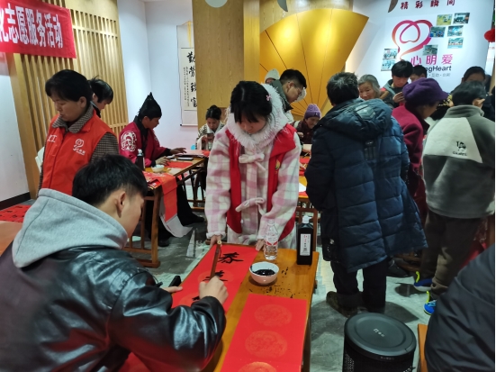 社区居民参与书法活动,杨正婧在旁协助拉展对联