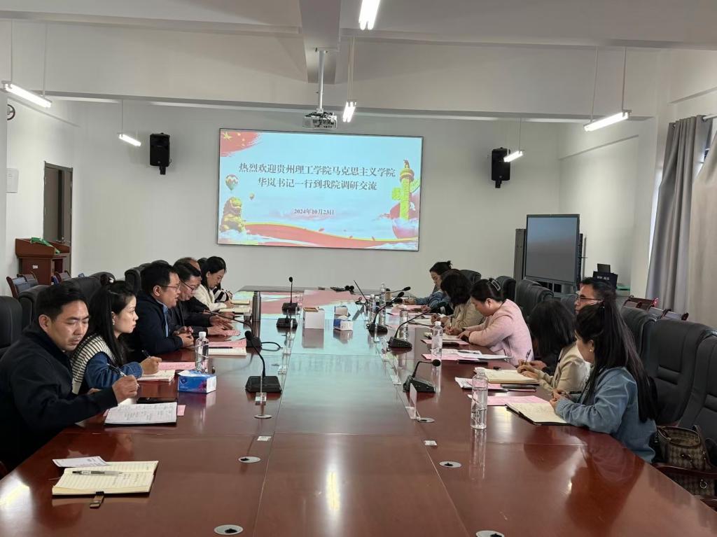 10月23日下午,贵州理工学院bw必威西汉姆联华岚书记一行到我院调研交流,调研交流会在善思楼4楼会议室召开,贵州理工学院bw必威西汉姆联副院长欧阳德君、杨立杰,形势与政策教研室主任孙瑞,教学科研科科长吴园园及教师代表聂祥乙、赵康琴出席。会议由我院党委书记杜凯主持,党委副书记王万江、副院长禹辉映及相关科室负责人参加。本次调研交流会围绕本科教育审核性评估工作、思政课教学改革创新工作、科研工作与党建工作展开。