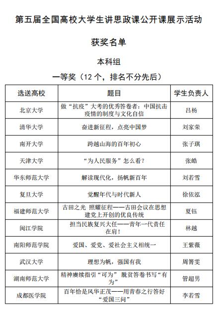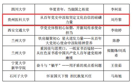 经过网络评审、现场展示交流暨决赛,由马克思主义中国化教研室副主任、党史党建研究中心专职副主任禹辉映团队指导,基础医学院学生刘丹黎主讲的《从百年党史中汲取坚定文化自信的磅礴力量》以贵州省一等奖第一名的成绩获教育厅推送至教育部参加第五届全国高校大学生讲思政课公开课展示活动。12月1日,教育部公布了获奖名单,该作品荣获全国三等奖,为贵州省推送作品取得的最好成绩。