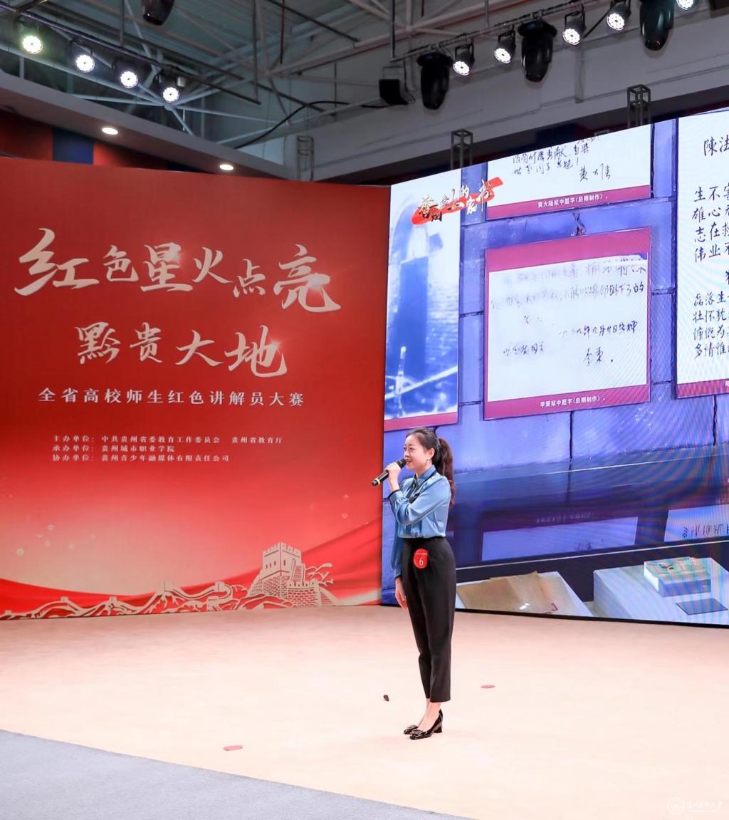11月25日,由中共贵州省委教育工作委员会、贵州省教育厅主办,贵州城市职业学院承办的“红色星火点亮黔贵大地”全省高校师生红色讲解员大赛决赛在贵阳举行。本次大赛全省共有76所高校参加。28名选手进入决赛,其中高职院校学生组与教师组各8人,本科院校学生组与教师组各6人,大赛4个组别共评出金奖4名、银奖4名、铜奖6名、指导教师奖7名、优秀奖14名、最佳组织奖4名。我校bw必威西汉姆联的参赛教师肖蓉参加本科院校教师组的角逐,喜获铜奖。